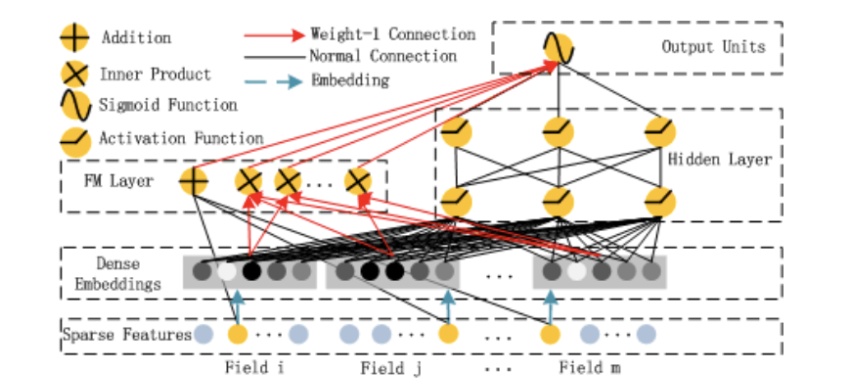 我们把一阶部分和二阶部分,DNN输出层这三部分合并累加,然后用sigmoid函数将其和变成一个概率值。